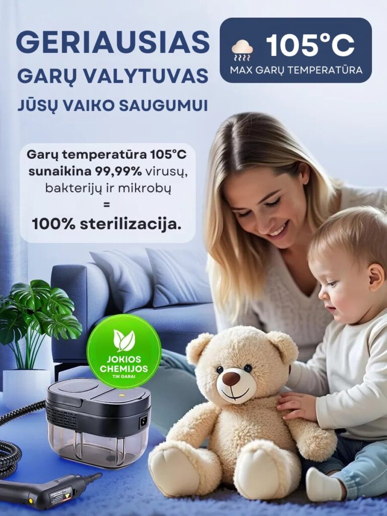🌿 Ekologiškas sprendimas – jokios chemijos, tik vandens garai – saugu vaikams ir augintiniams.